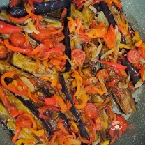 Викласти нарізані помідори в сковороду до цибулі та перцю. Смажити все до рум'яного кольору.