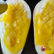 На звороті зрізати трохи шкірку (для того щоб вийшло рівне денце і половинка не гойдалася у формі).