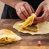 Викласти начинку на млинці, згорнути рулетиками або конвертами.