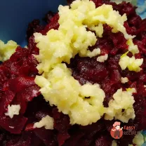 Буряк натерти на великій тертці та поєднати з іншими інгредієнтами.