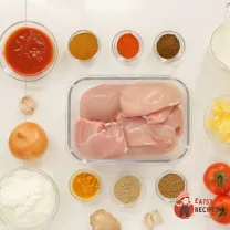 Змішати йогурт, 2 зубчики подрібненого часнику, 10 г подрібненого імбиру, зіру, коріандр, кардамон, пів чайної ложки кайенського перцю та куркуму у великій чаші. Додати сіль та перець.