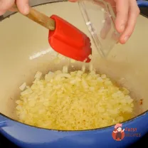 У товстостінній каструлі розігріти масло, обсмажити нарізану середніми кубиками цибулю до прозорості, додати подрібнений часник і імбир, готувати, помішуючи, поки суміш не набуде коричневого відтінку.