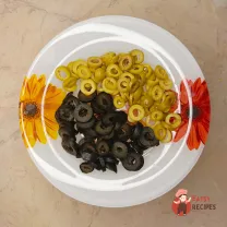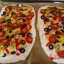 Розкласти на коржики почергово часник, цибулю, жовтий перець, червоний перець, чилі, оливки, маслини, половинки помідорів, гілочки розмарину, збризкати маслом.