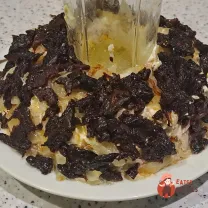 Чорнослив залити окропом на 5 хвилин|мінути|. Воду злити. Просушити чорнослив паперовим рушником, нарізати соломкою і викласти на смажену цибулю.