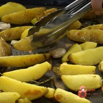 Перед подачею дістати і викинути часник та розмарин, картопля присипати великою сіллю та одразу подавати.