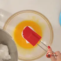 Продовжувати збивати, додаючи по одному жовтки, потім розпушувач та борошно. Тісто за консистенцією має нагадувати сметану.