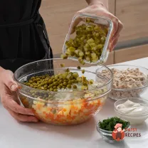 Заправити майонезом салат перед подачею. Посолити і поперчити до смаку.
