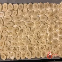 На лист, застелений пергаментом, викласти більшу частину куха (борошна, змішаного з цукром і олією) і кружечки бананів.
