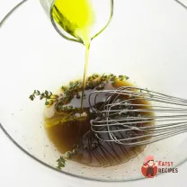 Курку замаринувати на півгодини у суміші соєвого соусу, меду, оливкової олії, чебрецю, цукру, оцту, солі та перцю.