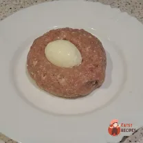 Очищене варене яйце вкласти у фарш і загорнути так, щоб яйце опинилося всередині фаршу.