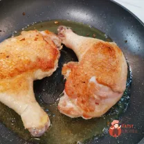 Викласти стегенця та посолити. Обсмажувати 3-5 хвилин на сильному вогні до золотистого кольору.