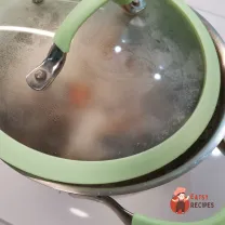 Варити на середньому вогні 30 хвилин|мінути|, не дозволяючи кипіти. За 5 хвилин|мінути| до кінця варіння посолити.
