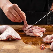 Курку розділіть на невеликі шматки: стегенця, крильця, грудки розріжте на дві-три частини, стегна зніміть з кістки й також розріжте навпіл. Залишений курячий скелет можна використати для приготування бульйону.