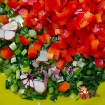 Перемішати і згасити всі разом на олії (додати 50 мл, що залишилися) приблизно 5-7 хвилин.