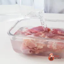 Розвести сіль у воді. Замочити куряче стегно в соляному розчині на 1:00, потім дістати і промити. Обсмажити на сковороді до готовності, охолодити та дрібно нарізати.