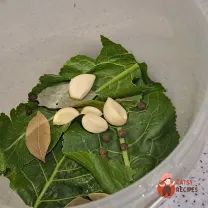 На листя хрону у відро викласти половину очищеного та вимитого часнику та 3 лаврові листки.