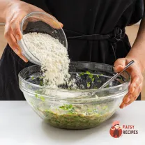 Змішати м'якоть баклажанів, цибулю та сире яйце, додати сванську сіль та рубану кінзу.