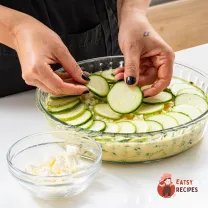 Форму для випікання змастити олією. Викласти тушковані кабачки, на них викласти моцарелу та половину тертої фети.