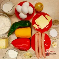 Дістати форму з холодильника, по черзі розподілити у ній овочі та сосиски, вилити заливку.