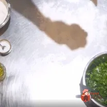 Покласти зелень у миску. Додати 2 грами солі, чорний перець та оливкову олію. Зелень має дати сік, для цього її треба добре перемішати.