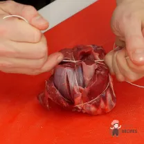 Цибулину розрізати навпіл, не очищаючи її. Встромити в половинки цибулі гвоздику, підсмажити цибулю на сухій сковороді на боці розрізу до темно-коричневого кольору. Кинути цибулю в каструлю до м'яса. Додати також букет гарні, перець горошком, лавровий лист. Варити на маленькому вогні 2,5 години. Посолити.