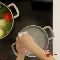 У великій каструлі закип'ятити воду, підсолити її та помістити в неї цибулю, перець та цукіні на 10 хвилин. В окремій невеликій каструлі також 10 хвилин поварити баклажани. Баклажани потрібно варити окремо, тому що вони можуть надати іншим овочам гіркоту.