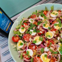 Яйця розрізати навпіл і викласти салат. Посолити та поперчити.