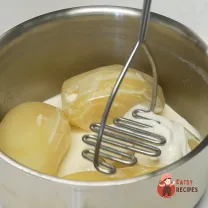 Картоплю зварити до готовності, розім'яти в пюре зі сметаною та вершками. Посолити і поперчити до смаку.