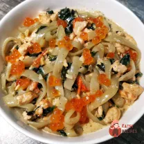 Додати фетучини в соус і перемішати. Небагато збільшити вогонь і гасити 2 хвилини.