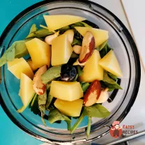 Нарізати сиром кубиками і додати його до інших інгредієнтів.