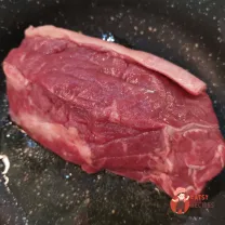У сковороді розігріти оливкову олію, викласти стейк. Смажити 3 хвилини на сильному вогні.