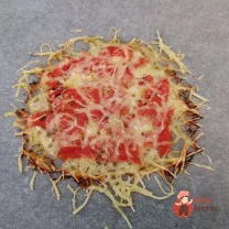 На застелений пергаментом лист викласти тертий сир (4 столові ложки), а зверху додати м'якоть помідора (вийняти ложкою зсередини). Присипати меленим перцем.