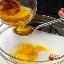 У великій мисці збити яйця, цукор, сіль і 60 грам розтопленої олії, що остигнула карамелізованої.