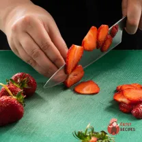 Полуницю (150 г) нарізати тонкими платівками. Прибрати вершки та полуницю в холодильник на 30 хвилин.