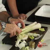 Порей трохи покатати по столу, як качалку, відрізати зелену частину, зняти верхній шар. Надрізати цибулю тонким ножем вздовж, витягнути серцевину, залишивши кілька верхніх шарів цибулі.