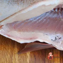 Видалити паперовим рушником зайву вологу та розрізати рибу по спині на дві частини.
