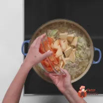 Розігріти качиний жир, що залишився в каструлі на середньому вогні. Обсмажити цибулю, цибулю-порей і селеру до м'якості.