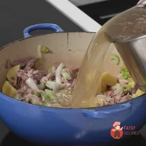 Додати м'ясо качки та картопля, залити все це процідженим бульйоном. Варити 15-20 хвилин|мінути|.